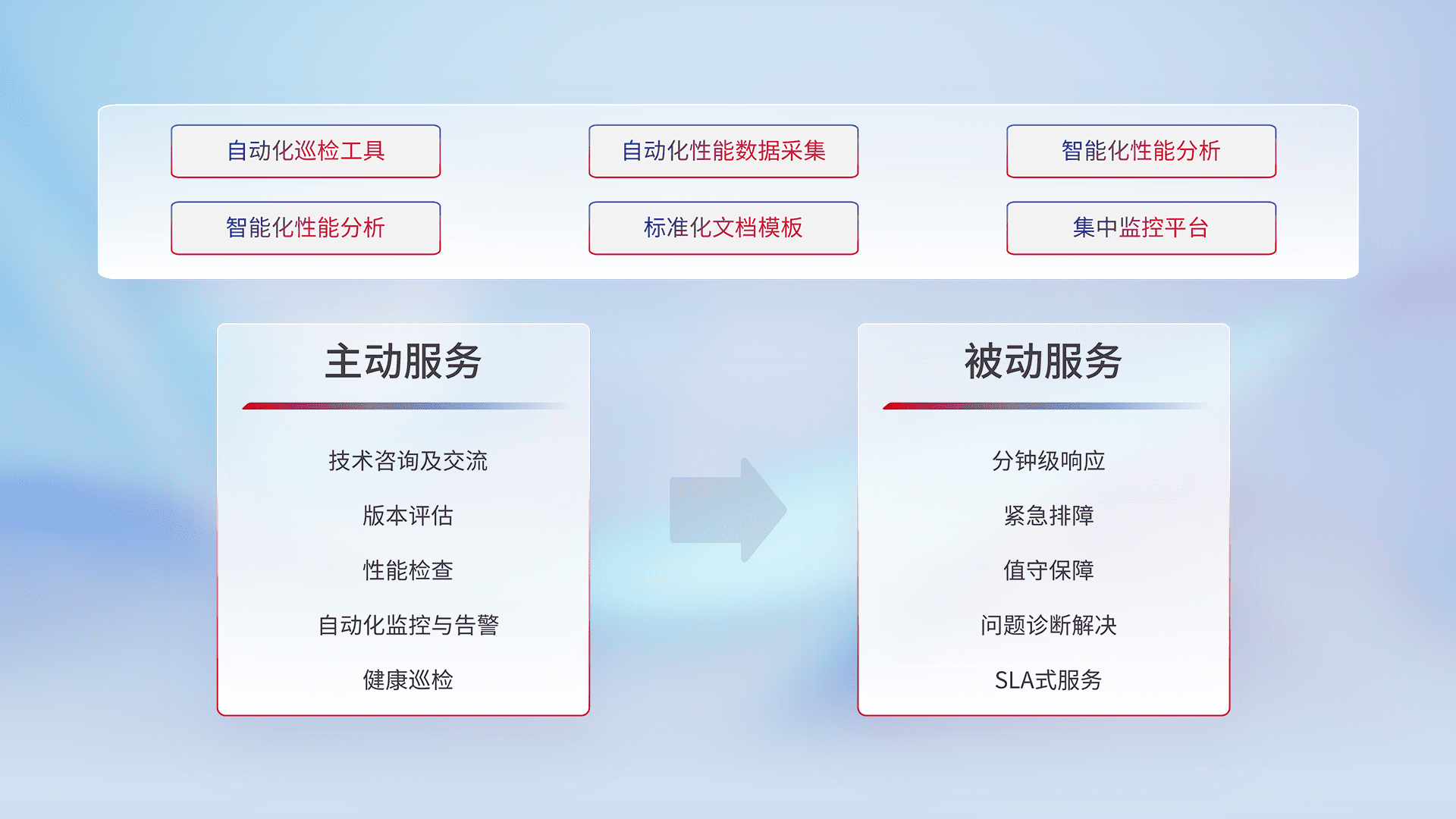 智能化工具和标准化文档,,,,保障服务质量,,提供主动服务(包含技术咨询、、、版本评估、、、、性能检查、、、、自动化监控与告警、、、、健康巡检)和被动服务包含(分钟级响应、、、紧急排障、、值守保障、、、、问题诊断解决、、、SLA服务)。。